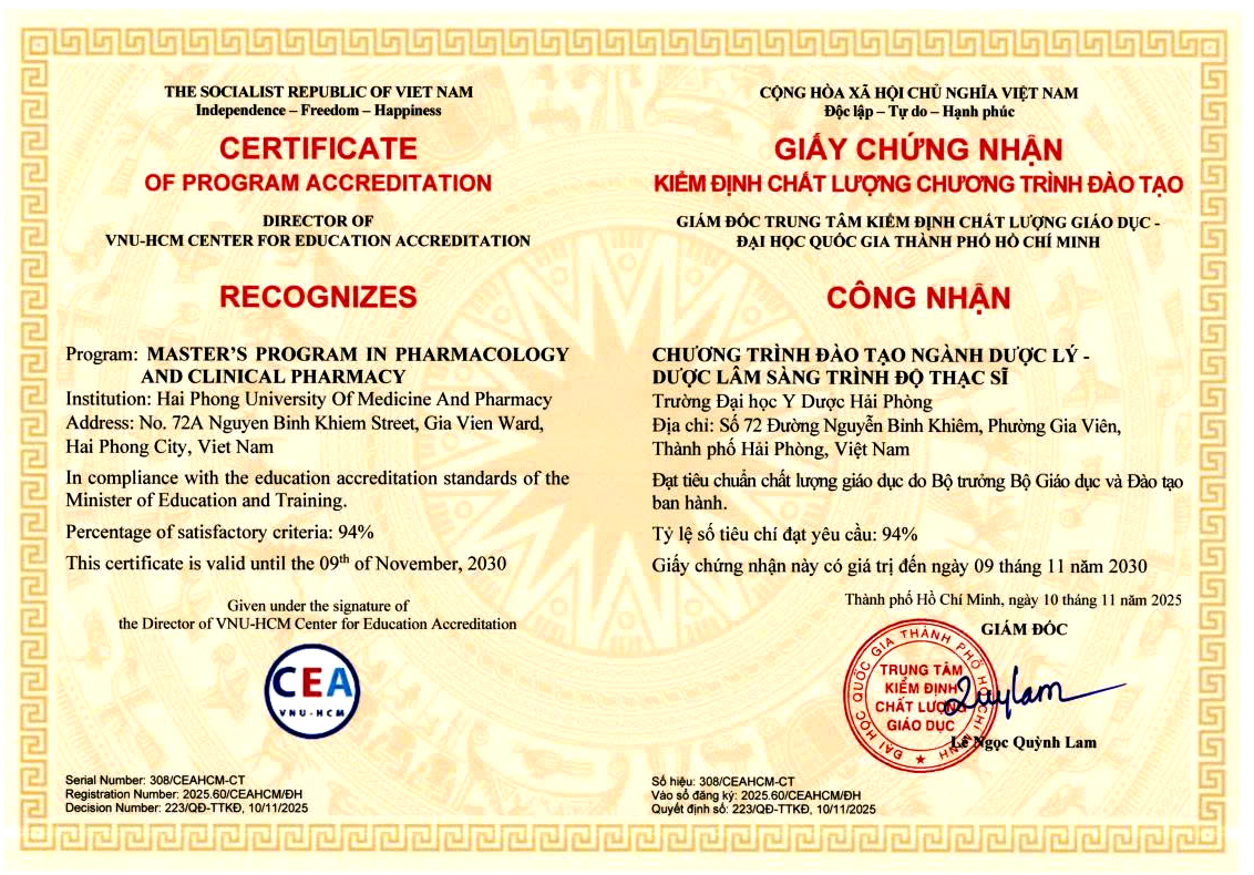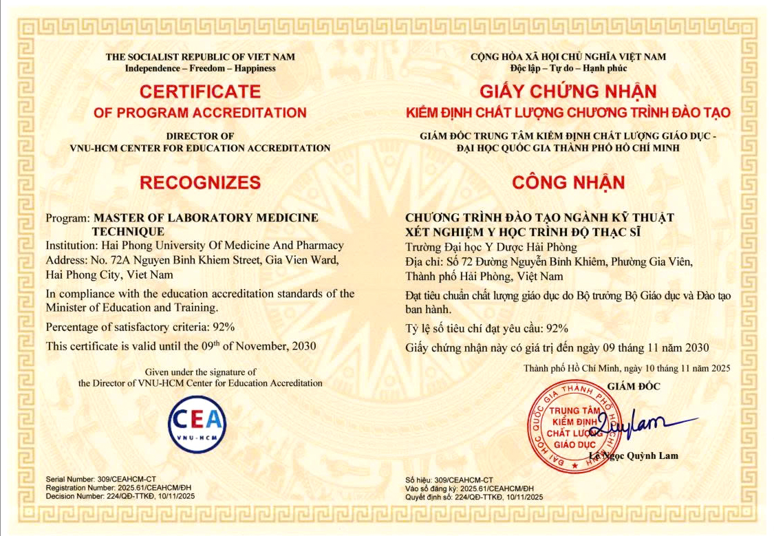 Chứng nhận kiểm định chất lượng chương trình đào tạo ngành Y học dự phòng trình độ đại học, ngành Dược lý - Dược lâm sàng trình độ Thạc sĩ, ngành Kỹ thuật xét nghiệm y học trình độ Thạc sĩ