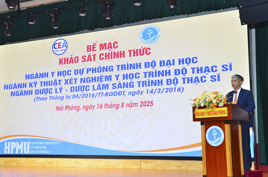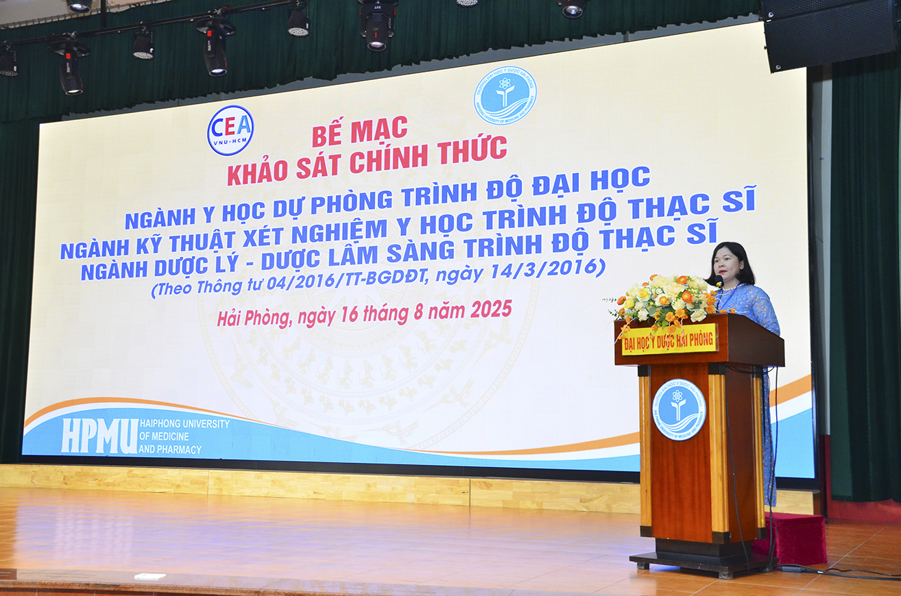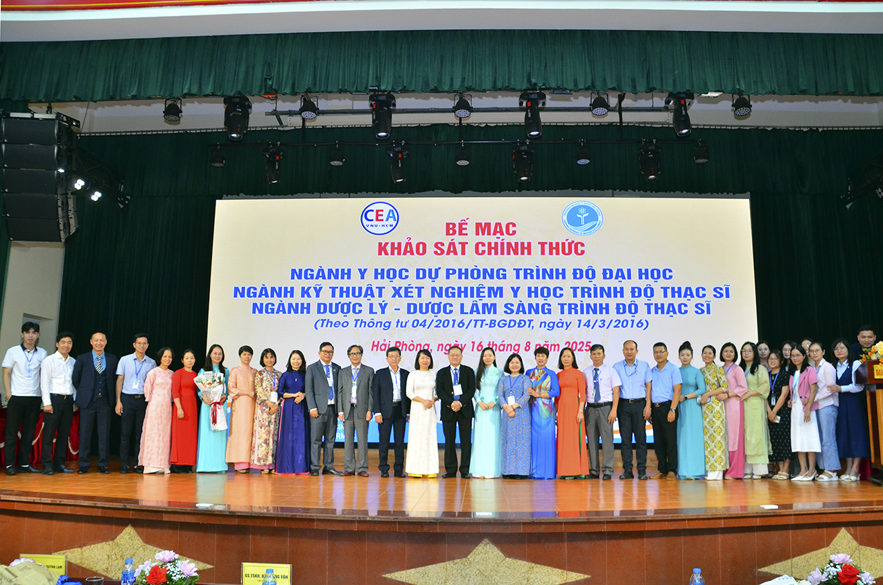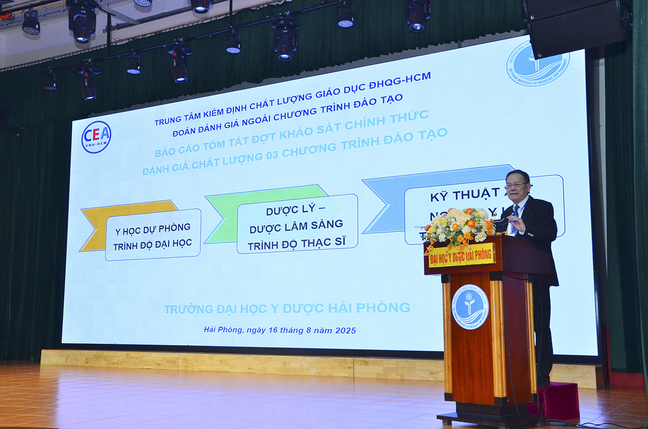 Sáng ngày 16/8/2025, Trường Đại học Y Dược Hải Phòng tổ chức Bế mạc chính thức đánh giá phối hợp với Trung tâm Kiểm định chất lượng giáo dục - Đại học Quốc gia Thành phố Hồ Chí Minh tổ chức chương trình bế mạc đợt khảo sát chính thức đánh giá chất lượng 01 chương trình đào tạo trình độ Đại học ngành Y học dự phòng và 02 chương trình đào tạo trình độ Thạc sĩ ngành Dược lý - Dược lâm sàng, Ngành Kỹ thuật xét nghiệm y học
