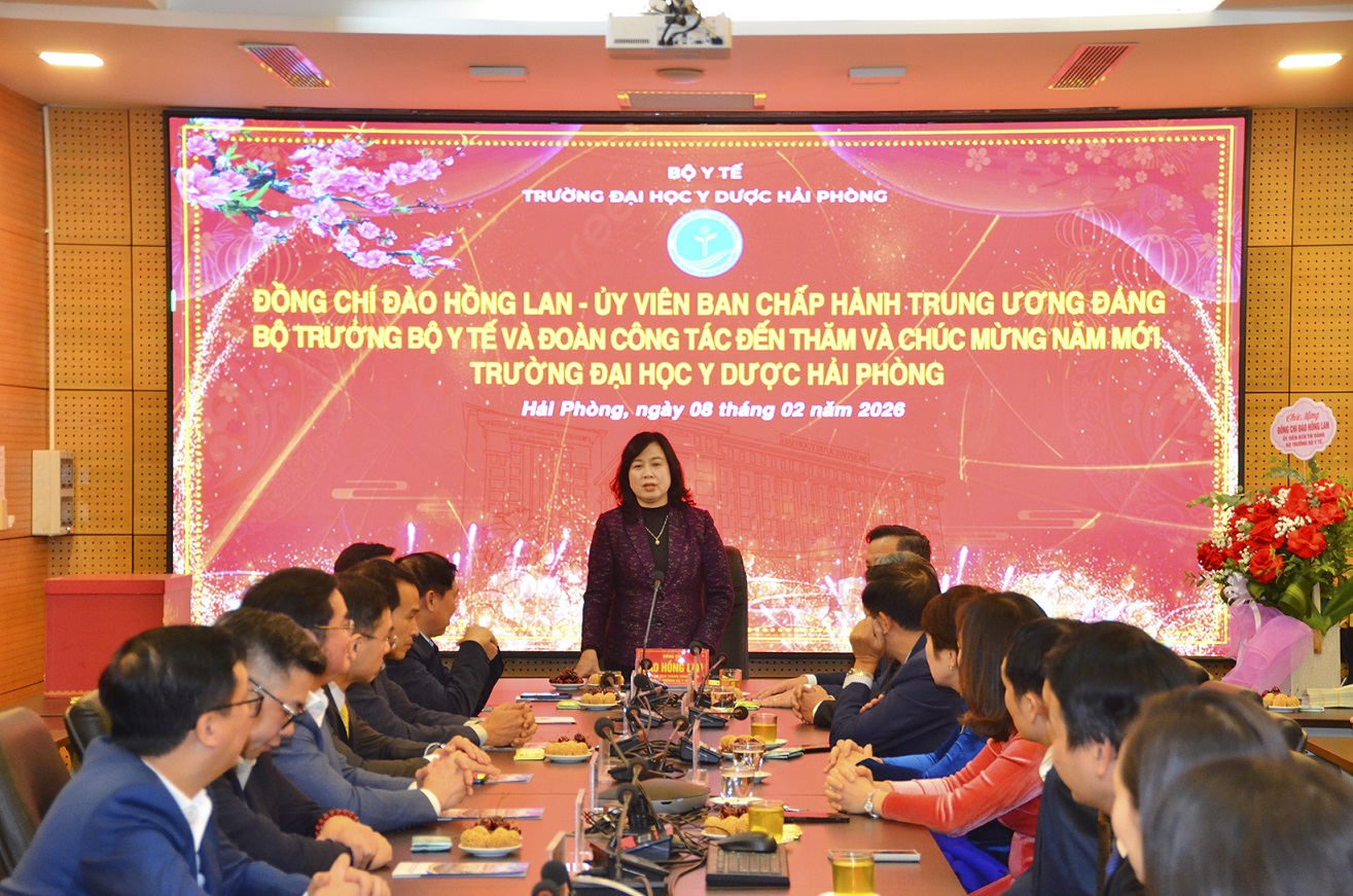Trong không khí hân hoan của những ngày giáp Tết Nguyên đán, ngày 08/02/2026, Đoàn công tác của Bộ Y tế do đồng chí Đào Hồng Lan - Ủy viên BCH Trung ương Đảng, Bộ trưởng Bộ Y tế dẫn đầu đã đến thăm, làm việc và chúc Tết đội ngũ cán bộ, giảng viên, người lao động Trường Đại học Y Dược Hải Phòng.