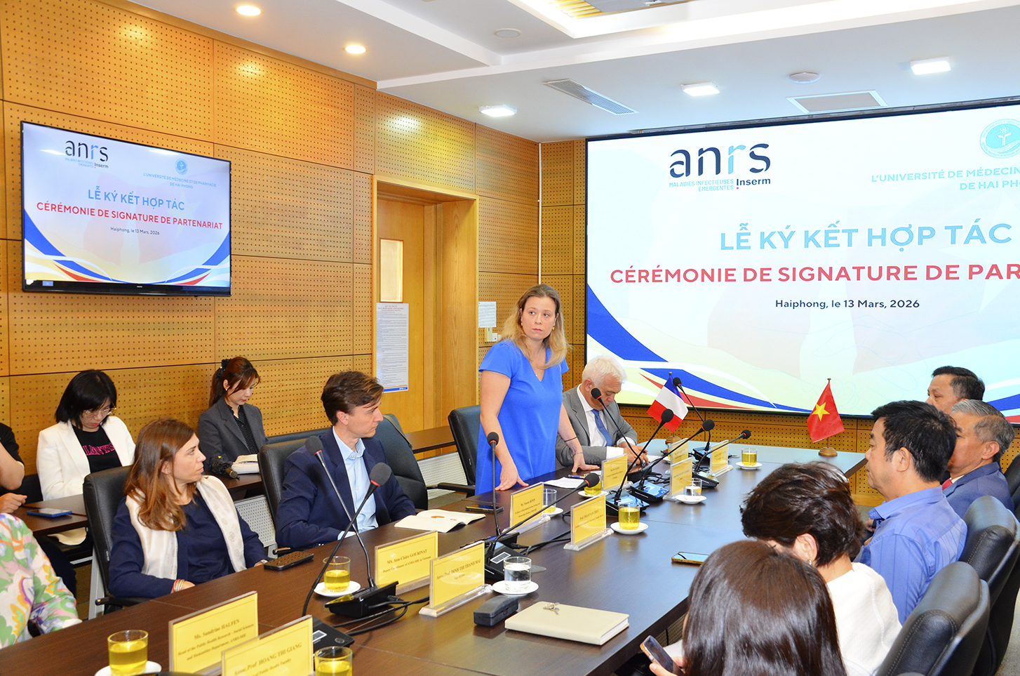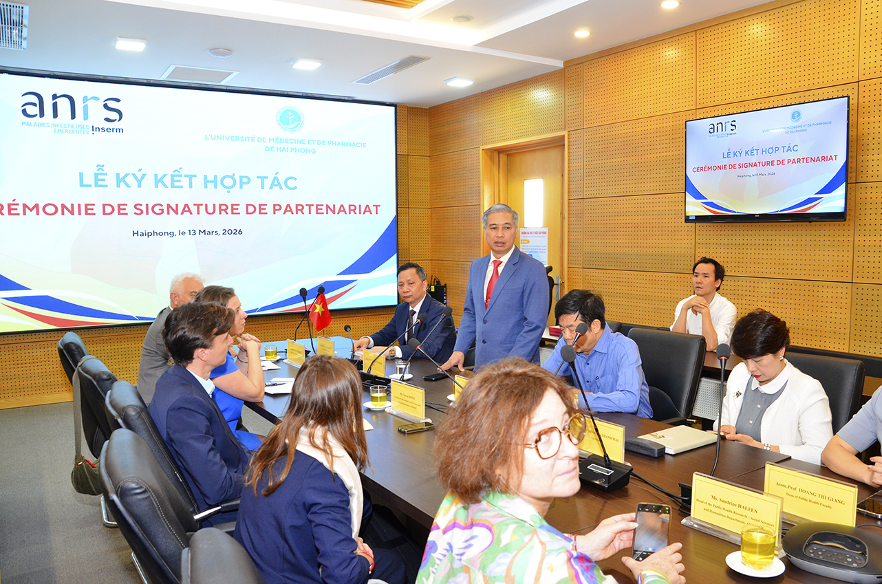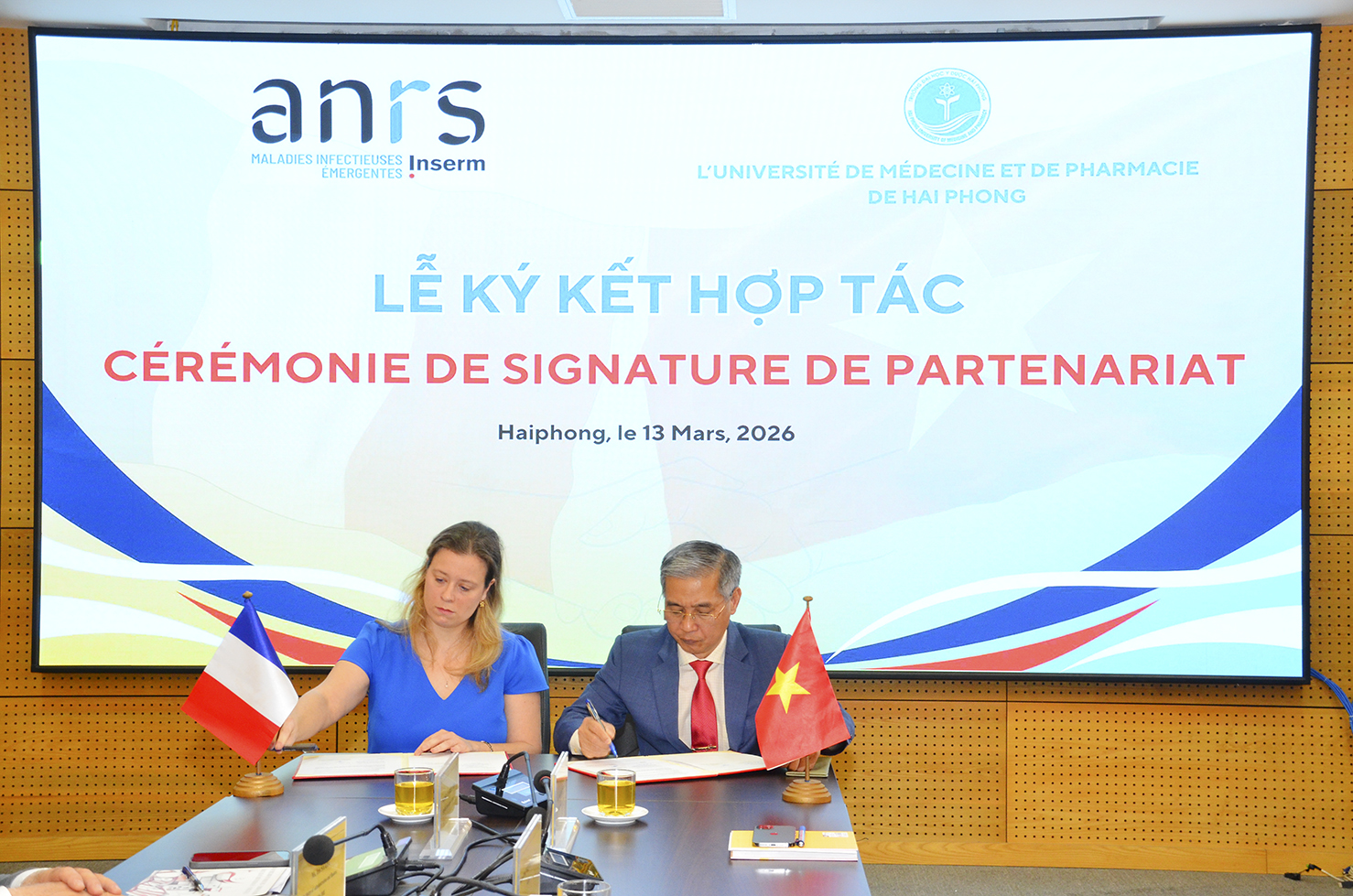 Ngày 13/03/2026, tại Phòng Hội thảo quốc tế, Trường Đại học Y Dược Hải Phòng (HPMU) đã long trọng tổ chức lễ đón tiếp và ký kết bản ghi nhớ hợp tác (MOU) với Cơ quan Quốc gia Pháp về Nghiên cứu các Bệnh Truyền nhiễm Mới nổi (ANRS|MIE). Đây là dấu mốc quan trọng, mở ra chương mới trong quan hệ đối tác chiến lược giữa hai đơn vị trong lĩnh vực nghiên cứu khoa học và đào tạo y khoa.