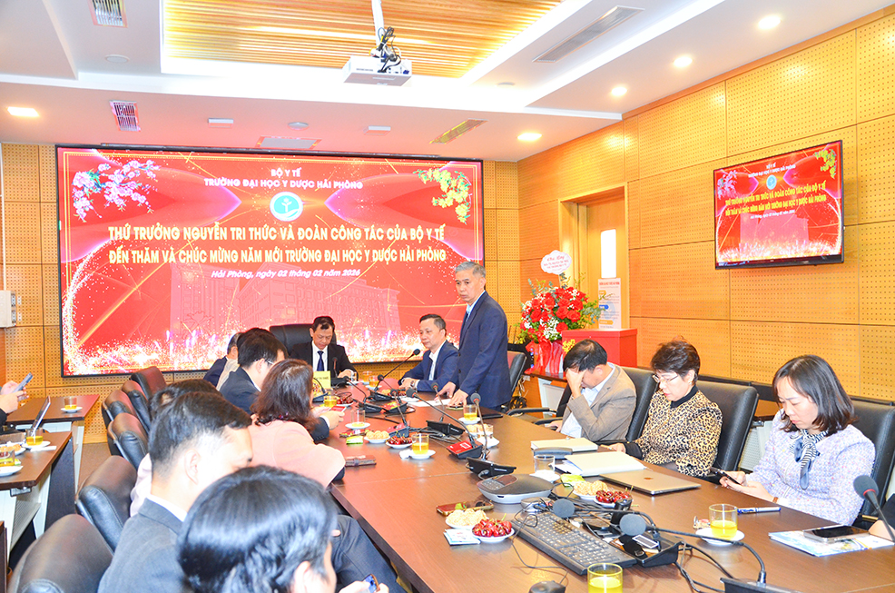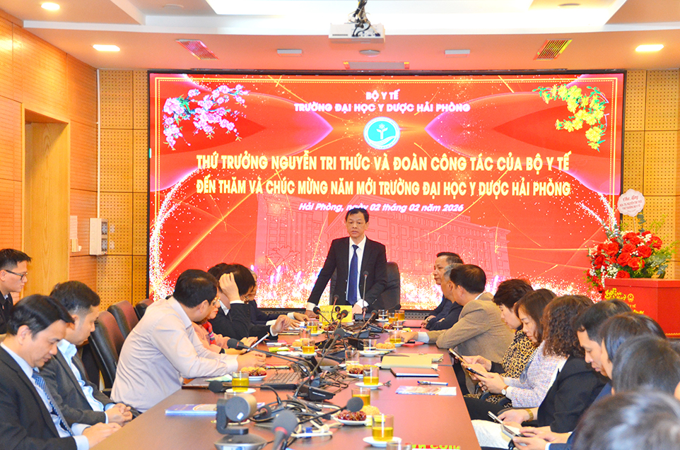 PGS.TS.BS. Nguyễn Tri Thức - Thứ trưởng Bộ Y tế phát biểu tại buổi gặp mặt Phát biểu tại buổi lễ, PGS.TS.BS. Nguyễn Tri Thức - Thứ trưởng Bộ Y tế bày tỏ sự vui mừng và biểu dương những kết quả ấn tượng mà nhà trường đã đạt được. Thứ trưởng nhấn mạnh rằng việc lọt vào Top 10 cơ sở giáo dục đại học chất lượng là minh chứng rõ nét cho quá trình phấn đấu bền bỉ của toàn thể cán bộ, giảng viên. Để tiếp tục phát huy thế mạnh, Thứ trưởng đề nghị nhà trường: Tiếp tục phát huy truyền thống, giữ vững tinh thần đoàn kết và trách nhiệm của người thầy thuốc; Nâng cao chất lượng đào tạo, tập trung xây dựng đội ngũ y bác sĩ tương lai có tay nghề cao, đáp ứng nhu cầu ngày càng khắt khe của sự nghiệp chăm sóc sức khỏe nhân dân; Khẳng định vai trò nòng cốt, tiếp tục là cơ sở đào tạo y khoa uy tín hàng đầu tại khu vực và trên cả nước. Nhân dịp xuân mới, Thứ trưởng Nguyễn Tri Thức đã gửi những lời chúc tốt đẹp nhất đến Ban lãnh đạo, các thầy cô giáo và các bạn học viên, sinh viên. Thứ trưởng tin tưởng rằng, với nền tảng vững chắc, Trường Đại học Y Dược Hải Phòng sẽ có một năm mới bứt phá, hoàn thành xuất sắc mọi nhiệm vụ được giao và phát triển bền vững.