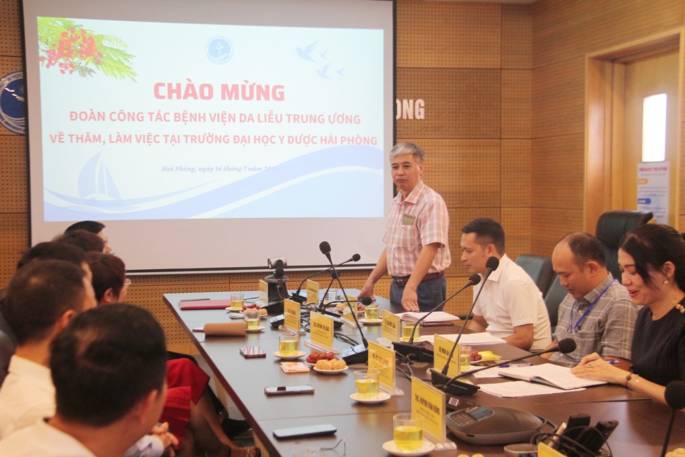 Đón và làm việc với đoàn, về phía Trường Đại học Y Dược Hải Phòng có PGS.TS. Nguyễn Văn Khải – Hiệu trưởng Nhà trường, lãnh đạo Phòng Quản lý Đào tạo Sau đại học, Phòng Quản lý Khoa học cùng các thầy, cô giảng viên Bộ môn Da liễu.