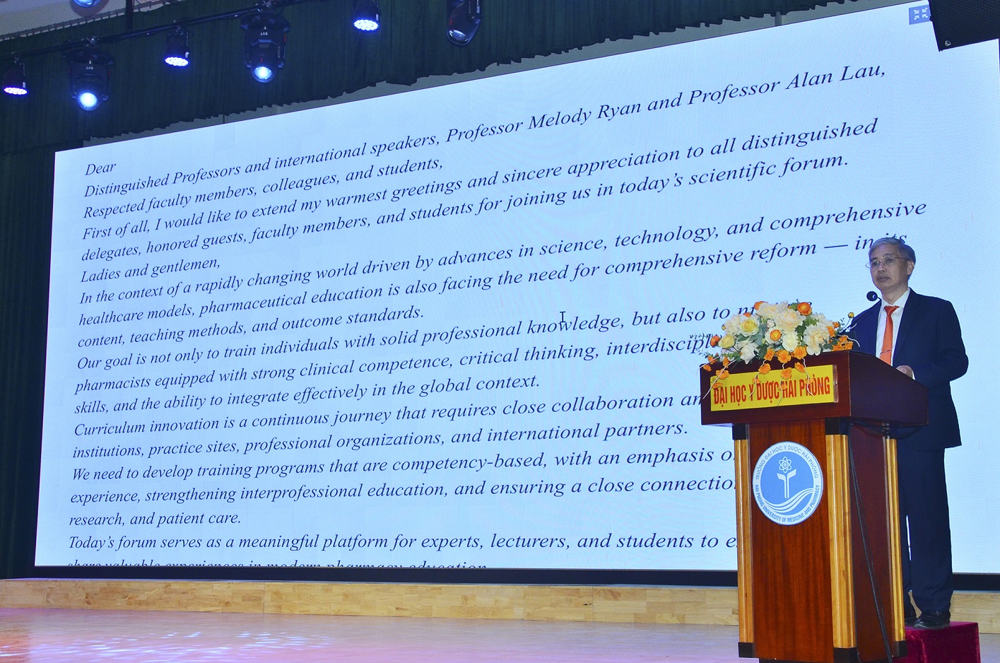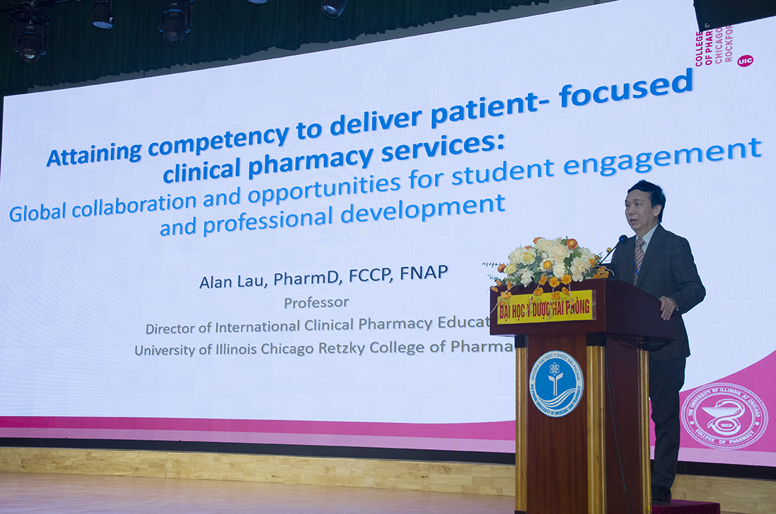 Đến dự và chia sẻ với buổi tọa đàm có GS. Alan Lau, Tiến sĩ Dược (Pharm.D.) - Giám đốc Chương trình Đào tạo Dược lâm sàng quốc tế, Đại học Illinois tại Chicago (UIC), Hoa Kỳ, GS. Melody Ryan, Tiến sĩ Dược (Pharm.D.) - Đại học Kentucky, Hoa Kỳ, về phía nhà trường có PGS.TS. Phạm Văn Linh - Bí thư Đảng ủy, Chủ tịch Hội đồng trường, PGS.TS. Nguyễn Văn Khải - Hiệu trưởng, Giám đốc Bệnh viện trường, PGS.TS. Nguyễn Thị Thu Phương - Trưởng Khoa Dược học cùng các thầy, cô giảng viên Khoa Dược học, các học viên, sinh viên Khoa Dược.
