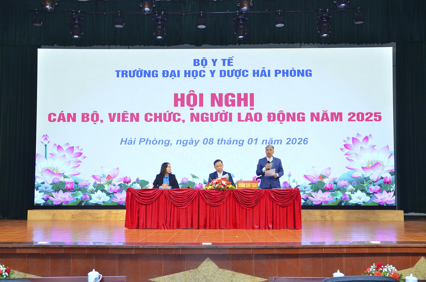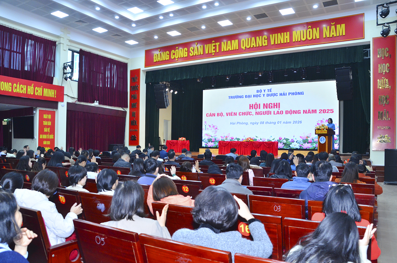 Ngày 08/01/2026, Trường Đại học Y Dược Hải Phòng long trọng tổ chức Hội nghị cán bộ viên chức năm 2025. Hội nghị là hoạt động chính trị quan trọng nhằm phát huy dân chủ của viên chức, người lao động; đánh giá toàn diện kết quả thực hiện nhiệm vụ trong năm 2025. Đồng thời xác định phương hướng, nhiệm vụ trọng tâm cho năm 2026, hướng đến xây dựng nhà trường phát triển ổn định, bền vững và thích ứng với yêu cầu đổi mới giáo dục đại học trong giai đoạn mới