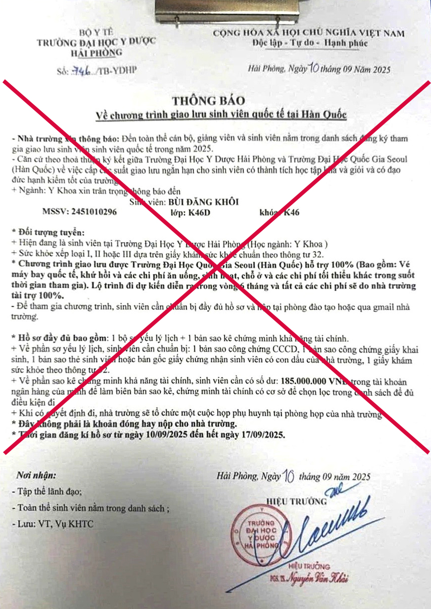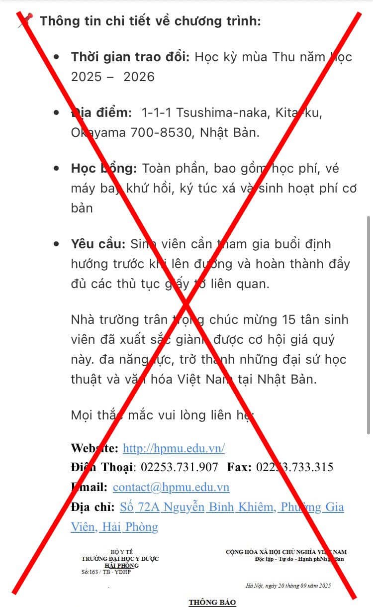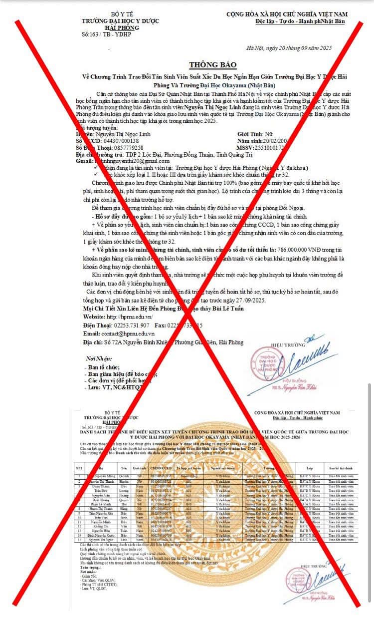 Trong thời gian gần đây, Trường Đại học Y Dược Hải Phòng ghi nhận một số văn bản giả mạo mang danh nghĩa Nhà trường được phát tán trên mạng xã hội, email hoặc qua các kênh không chính thống. Đây là hành vi lừa đảo có chủ đích, nhằm lợi dụng sự tin tưởng của sinh viên và phụ huynh để chiếm đoạt tài sản hoặc thu thập thông tin cá nhân.