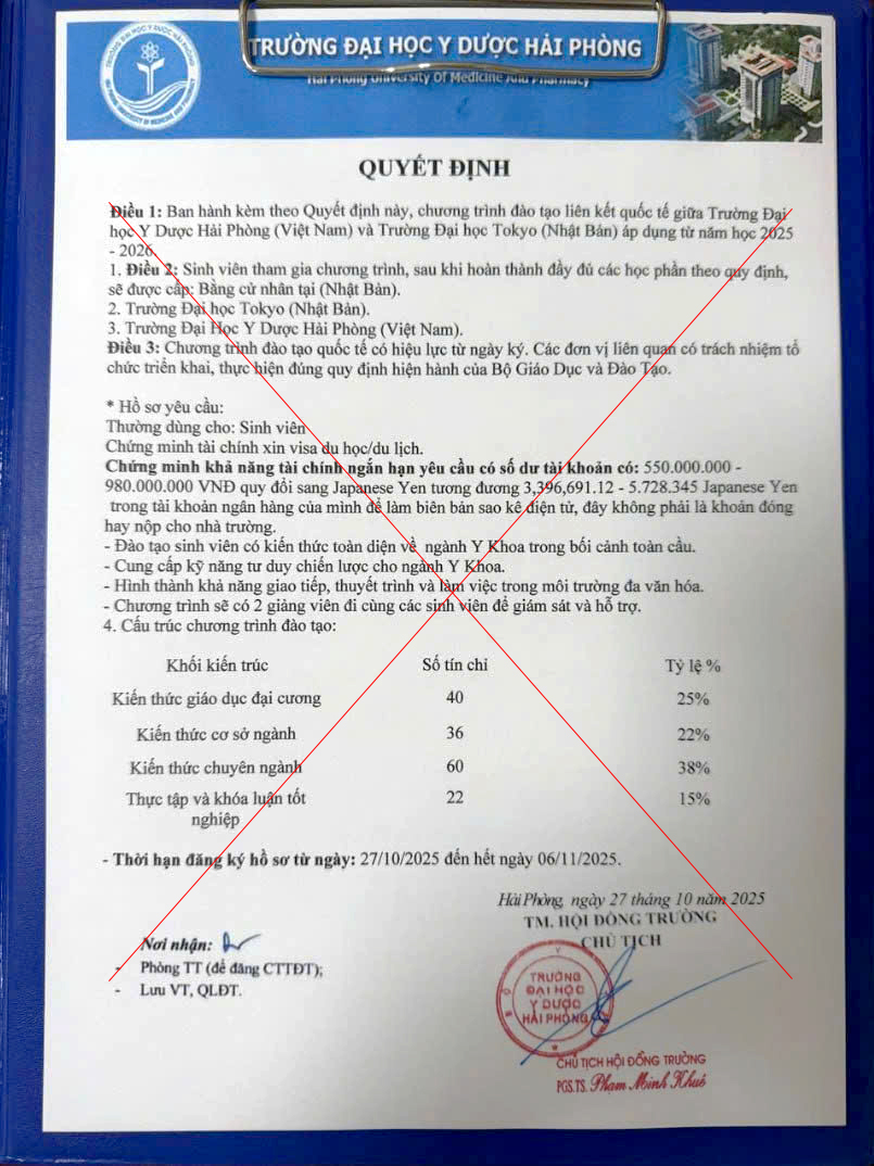Trong thời gian gần đây, Trường Đại học Y Dược Hải Phòng đã phát hiện và ghi nhận sự xuất hiện của văn bản, thông báo giả mạo được phát tán qua mạng xã hội hoặc các kênh không chính thống khác. Nội dung các văn bản này mạo danh Nhà trường liên kết với Trường Đại học Tokyo (Nhật Bản) để tuyển sinh, cấp học bổng, hoặc tổ chức chương trình giao lưu/trao đổi sinh viên quốc tế. Đây là hành vi lừa đảo có chủ đích nhằm lợi dụng uy tín của Nhà trường và sự tin tưởng của Quý vị để chiếm đoạt tài sản hoặc thu thập thông tin cá nhân.