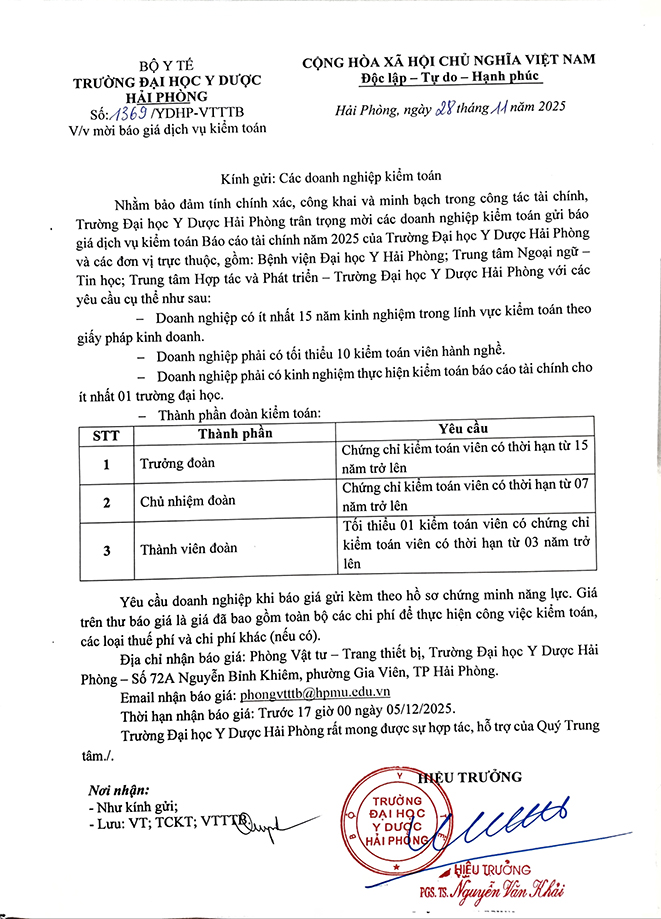 Nhằm bảo đảm tính chính xác, công khai và minh bạch trong công tác tài chính, Trường Đại học Y Dược Hải Phòng trân trọng mời các doanh nghiệp kiểm toán gửi báo giá dịch vụ kiểm toán Báo cáo tài chính năm 2025 của Trường Đại học Y Dược Hải Phòng và các đơn vị trực thuộc, gồm: Bệnh viện Đại học Y Hải Phòng; Trung tâm Ngoại ngữ – Tin học; Trung tâm Hợp tác và Phát triển - Trường Đại học Y Dược Hải Phòng với các yêu cầu cụ thể như sau: