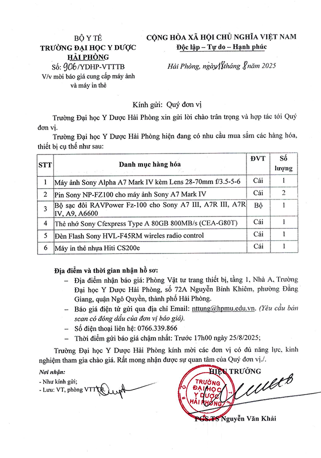 Trường Đại học Y Dược Hải Phòng hiện đang có nhu cầu mua sắm máy ảnh và máy in thẻ, kính đề nghị quý đơn vị gửi thông tin