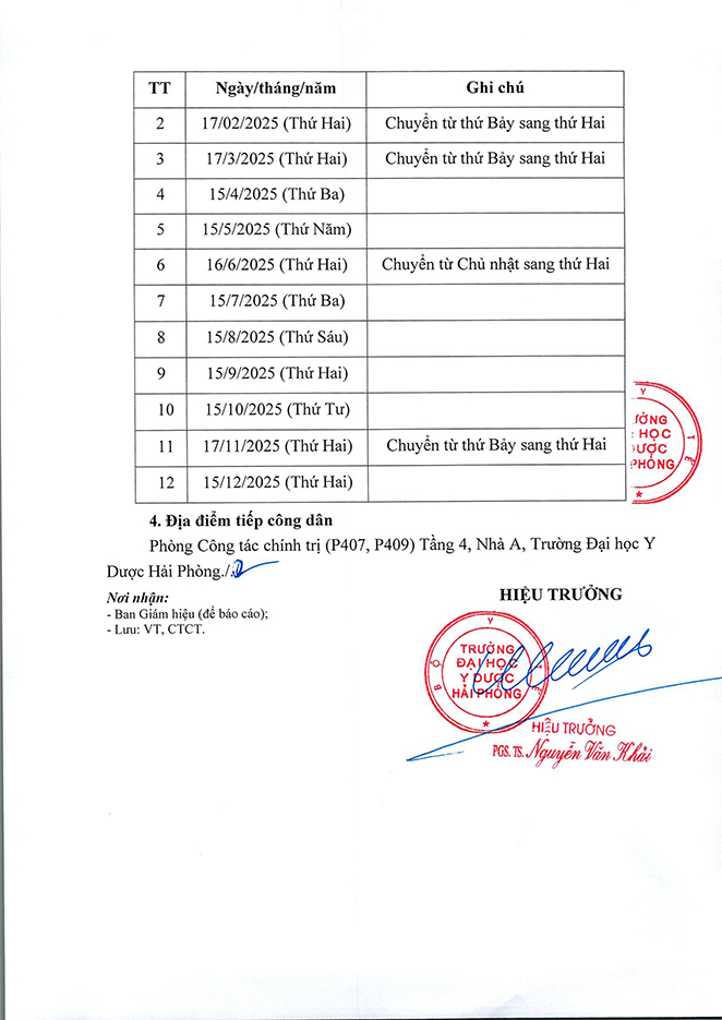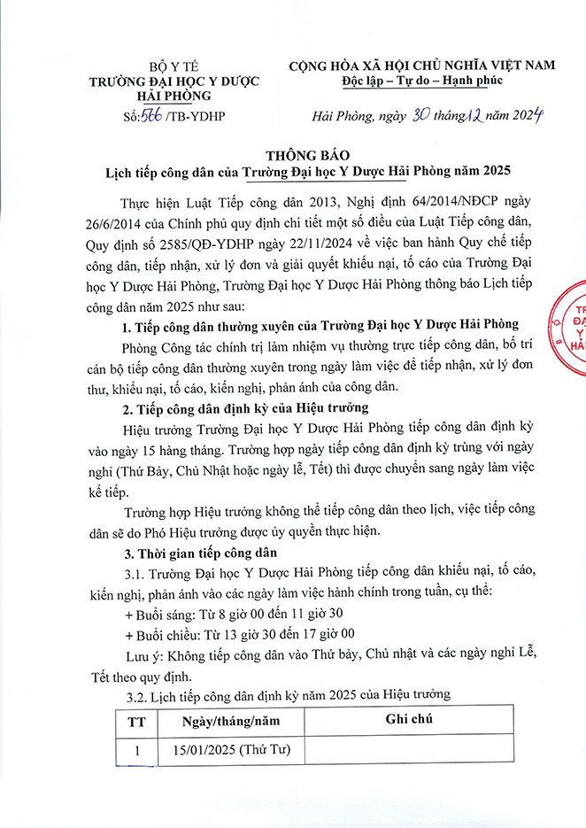 Thông báo Lịch tiếp công dân của Trường Đại học Y Dược Hải Phòng năm 2025