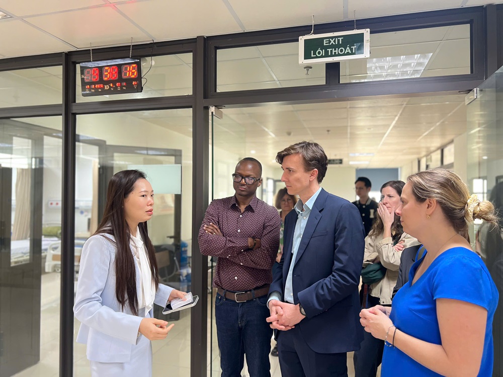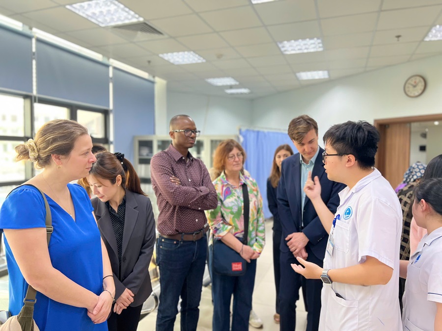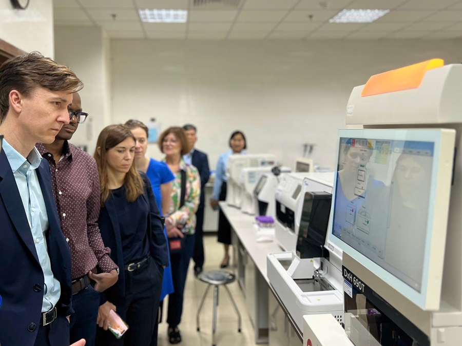 Trong chương trình làm việc, đoàn chuyên gia đã tham quan thực tế tại Khu khám bệnh, Trung tâm Thử nghiệm lâm sàng và Tương đương sinh học cùng Khoa Xét nghiệm tổng hợp của Bệnh viện. Tại các đơn vị, đoàn đã tìm hiểu về quy trình khám chữa bệnh, hệ thống cơ sở vật chất, trang thiết bị, cũng như năng lực triển khai các nghiên cứu lâm sàng và hoạt động xét nghiệm phục vụ công tác chẩn đoán, điều trị.